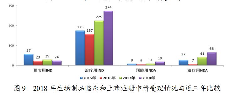 2018年,药审中心受理1类生物制品创新药注册申请106个品种(包括预防用生物制品6件,治疗用生物制品117件,共涉及123件受理号),较2017年增长了62%。其中,受理1类生物制品NDA 9个品种(包括预防用生物制品2件,治疗用生物制品9件,共涉及11件受理号),较2017年增长了4.5倍。