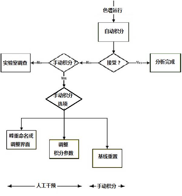 但是,如果积分不能接受我们需要进行第二个决策:该分析程序是否允许手动积分(无论该术语包含哪些内容)?如果不能,下一阶段就是实验室调查。我们应该考虑使用哪些方法不能手动积分吗?如果是APIs(active pharmaceutical ingredients)的检测或对最终产品的活性成分的注册方法呢?如果这些峰不能被正确积分,你就没辙吗?我们将在完成这个流程图讨论的时候思考这是否站得住脚?