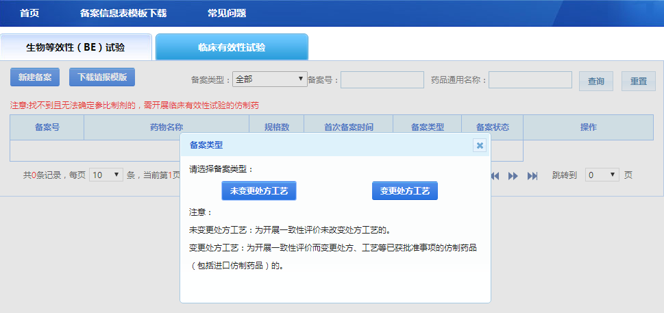 在临床有效性试验标签页点击“新建备案”按钮弹出备份类型对话框,根据开展一致性评价时是否变更处方工艺选择备案类型,如下图: