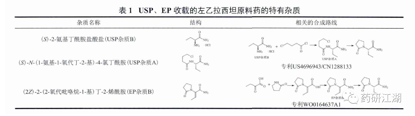 药典等文献也是杂质谱分析的重要参考,可参考文献中报道的同品种或相同结构类型药物的杂质信息。但需要注意的是,由于合成路线可能不同,不建议简单套用文献报道的工艺杂质,需要结合自拟的合成工艺分析是否可能产生与文献报道一致的杂质。例如,因合成工艺不同,USP38、EP8.0的左乙拉西坦原料药标准中收载了不同的特定工艺杂质,(S)-2-氨基丁酰胺盐酸盐(USP杂质B)和(S)-N-(1-氨基-1-氧代丁-2-基)-4-氯丁酰胺(USP杂质A)是USP收载的特有杂质,(2Z)-2-(2-氧代吡咯烷-1-基)丁-2-烯酰胺(EP杂质B)是EP收载的特有杂质,分别产生于不同的合成路线(表1);毒性杂质2-羟基吡啶(EP杂质C)虽然在USP38、EP8.0中均有收载,也建议结合自拟制备工艺(是否使用该合成试剂)考虑是否需要作为特定杂质进行研究。