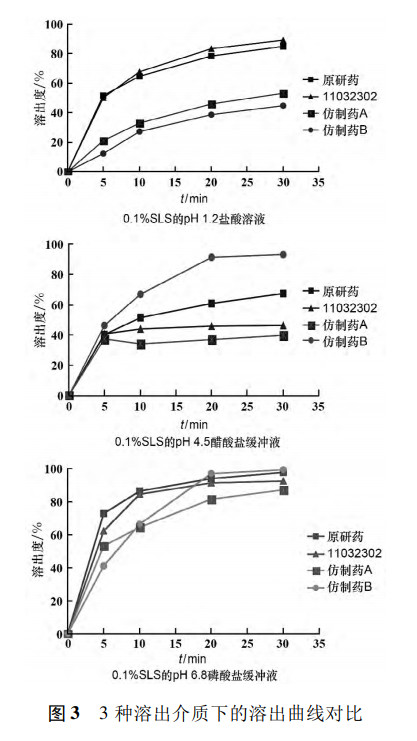 为进一步考察新的溶出度方法是否确实能预测不同企业生产的同一片剂在体内的行为,研究组还选用已在美国批准上市的 2 个同品种的仿制药 A 及仿制药 B,同时与原研药及仿制品( 采用细粒径原料药制成的仿制片剂,批号: 11032302) 进行了溶出曲线的对 比,3 种溶出介质下的溶出曲线对比结果如图3 所示。