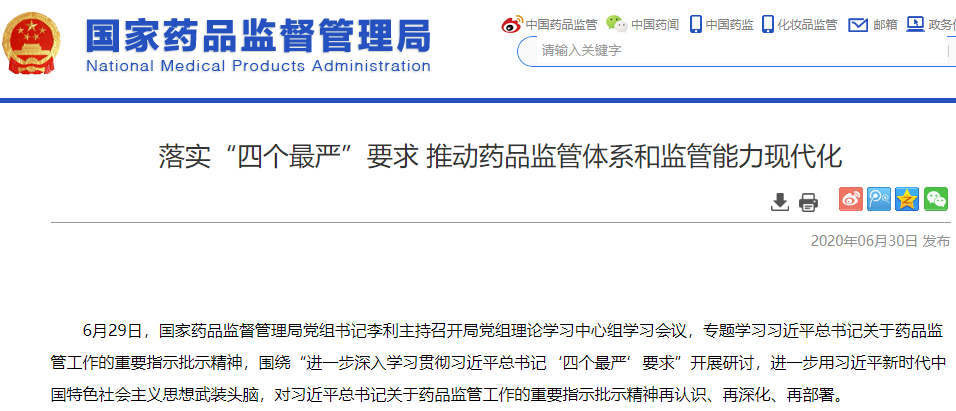 我们习大大强调过:药品安全责任重于泰山。而药品安全问题离不开监管。就在今年6月底,国家药品监督管理局发布了《落实“四个最严”要求 推动药品监管体系和监管能力现代化》的公告。