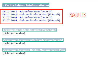 点击后我们会进入下一个界面,点击右上角的【- Fach-/Gebrauchsinformationen】图标,就可以看到说明书了。从下图中,我们可以看出该药的说明书分别在2013年和2016年做过修订。大家后台回复【德国】,可以获得该药在2016年修订过的说明书。