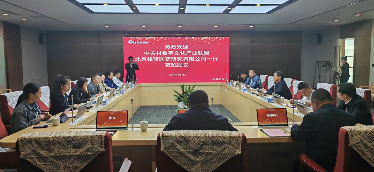 2024年4月7日上午,中关村数字文化产业联盟副理事长兼秘书长李佳臻与北京铭研医药研究有限公司创始人、CEO何小炳等一起与固安县领导座谈交流,固安县县委书记付顺义,县委常委、常务副县长靳志强,县委常委、副县长王健等县领导出席了座谈会。
