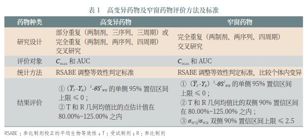 对于高变异药物及窄窗药物(如卡马西平、环孢素)等在研究设计和评价标准上也可能需要做出相应的调整(表1)。