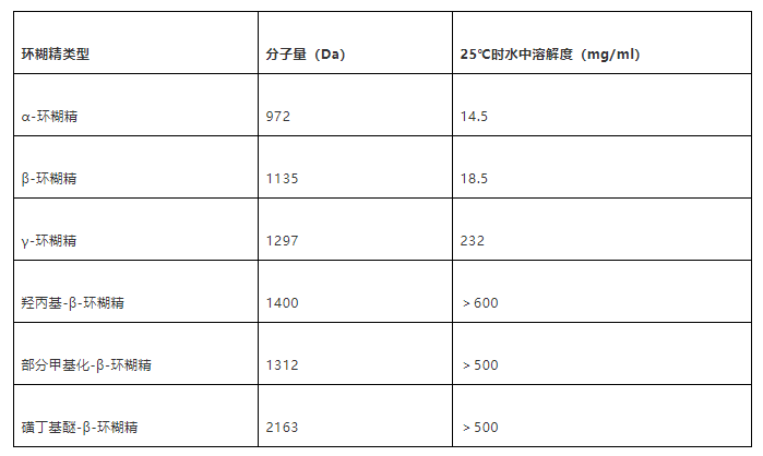 天然环糊精任何形成氢键的羟基被取代,即使是被亲脂性基团取代,都可以导致其水溶性的显著提高,基于这种情况,目前开发出许多环糊精的衍生物,如α-环糊精、β-环糊精、γ-环糊精、2-羟丙基-β-环糊精、磺丁基醚-β-环糊精等。