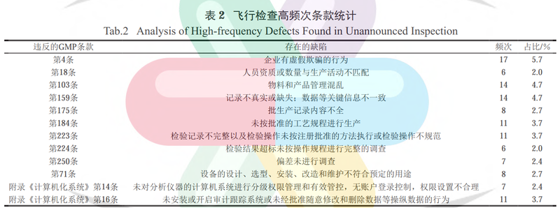 陆仕华等对 2017 年广西 11 家药品生产企业飞行检查发现的缺陷结果进行分析,指出其缺陷主要集中以下方面 :企业未按批准处方工艺组织生产、人员培训不到位、物料与产品管理混乱、生产 管理不到位、质量控制与保证抓得不够严。